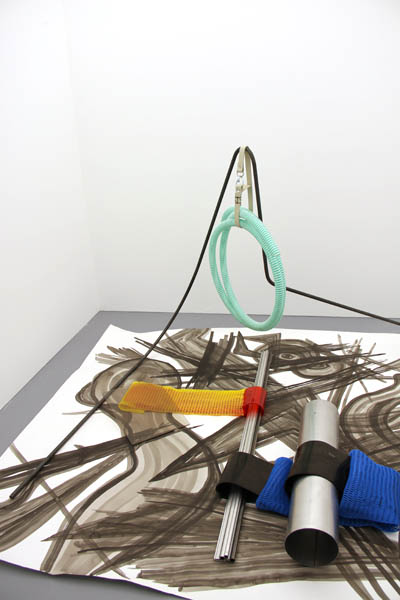 ohne titel (1), 2017, 80cm x 150cm x 130cm, Tinte auf Papier, verschiedene Metallrohre, Kunststoff-Netze, Weich-PVC, Gummi, Stahl, Gartenschlauch, Ledergurt, Glasplatte