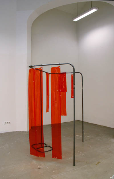 „shower curtain hooks with rollers“, 2017, 195cm x 150cm x 90cm, Stahl, Weich-PVC, Schlüsselringe, Ösen, Duschvorhangringe