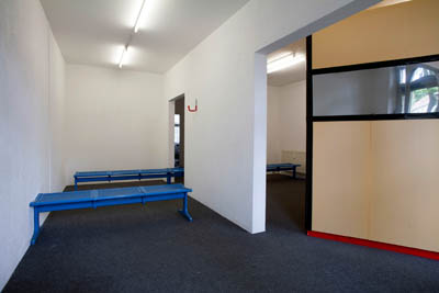 „Ein Raum mit Teppich“ Ausstellung mit Samuel Lanchin im EX14, Dresden 2017, Styrodur-Platten, Gummi, PVC, Plexiglas, Spiegelfolie, Sitzbänke, Fahrradhaken, Holzkonstruktion