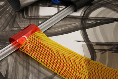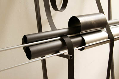 ohne titel (2), 2017, 175cm x 170cm x 150cm, Ofenrohre, Stahl, Auto-Gurt, Isolierschläuche, Kunststoffrohre, Aluminiumrohre, Edelstahlrohre, Gummi, Tinte auf Seide