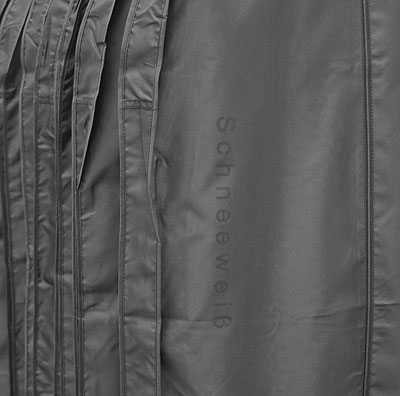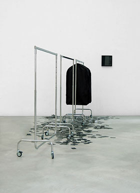 hidden, 2010, Rollgarderoben, Siebdruck auf Anzugshüllen, Anzüge, Kleiderbügel, Papier, Lack auf Glas im Rahmen, ca. 190 x 150 x 500 cm