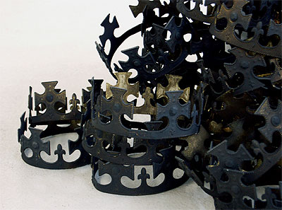 let me coach you, 2010, 27 Kunststoffkronen, Bitumen, Kunststoffsack, Federn, Polyesterschnur, 100 x 120 x 100 cm