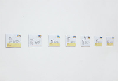 "Hätte ja oder Ordnung sollte (Rückblick)", 2009, Briefe, Farbstift, Stempelaufdruck, Briefmarken, Etiketten, 7-teilig, je ca. 11 x 16 cm